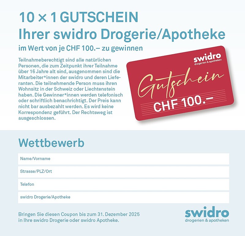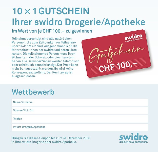 10× Gutscheine Ihrer swidro Drogerie/Apotheke im Wert von je CHF 100.‒ zu gewinnen.